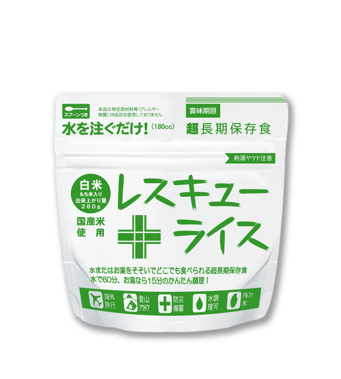 レスキューライスはオリジナル製法にて7年保存可能なアルファ米です。お湯やお水を注ぐだけで、いつでもどこでも簡単に、美味しい炊きたて風味のごはんが食べられるアルファ化米。さらにもち米入りで食感もよく、少量で効率よくエネルギー補給ができます。
