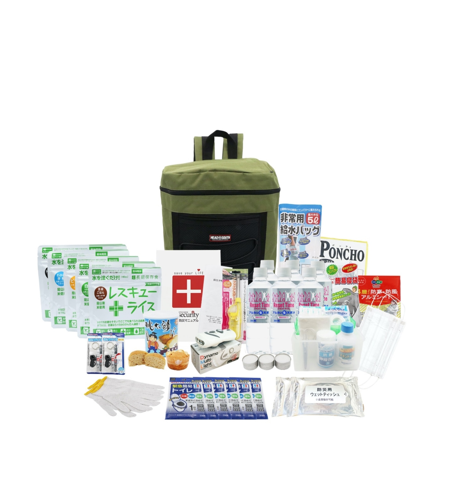 非常持ち出し用リュック(27L)小袋付×1、給水バッグ(5L)×1、レスキューライス(白米)×1、レスキューライス(わかめご飯)×1、レスキューライス(ドライカレー)×1、レスキューライス(ピラフ)×1、レスキューライス(五目ごはん)×1、災害備蓄用パン黒豆×1、7年保存水500ml×6、手回し充電ラジオライト(スマホ対応)×1、カップローソク×3、防災アニュアル×1、ファイアスターター×1、レスキューシート(軽量コンパクト)×1、目かくしポンチョ×1、簡易寝袋×1、軍手×2、アルミホイッスルID付×2、緊急簡易トイレ×6、防災用ウェットティッシュ20P×1、マスク(3層式)×2、救急箱×1、ハサミ小×1、包帯L×1、オキシドール×1、絆創膏×1、カットバン×1、ティッシュ×1、防災手帳×1