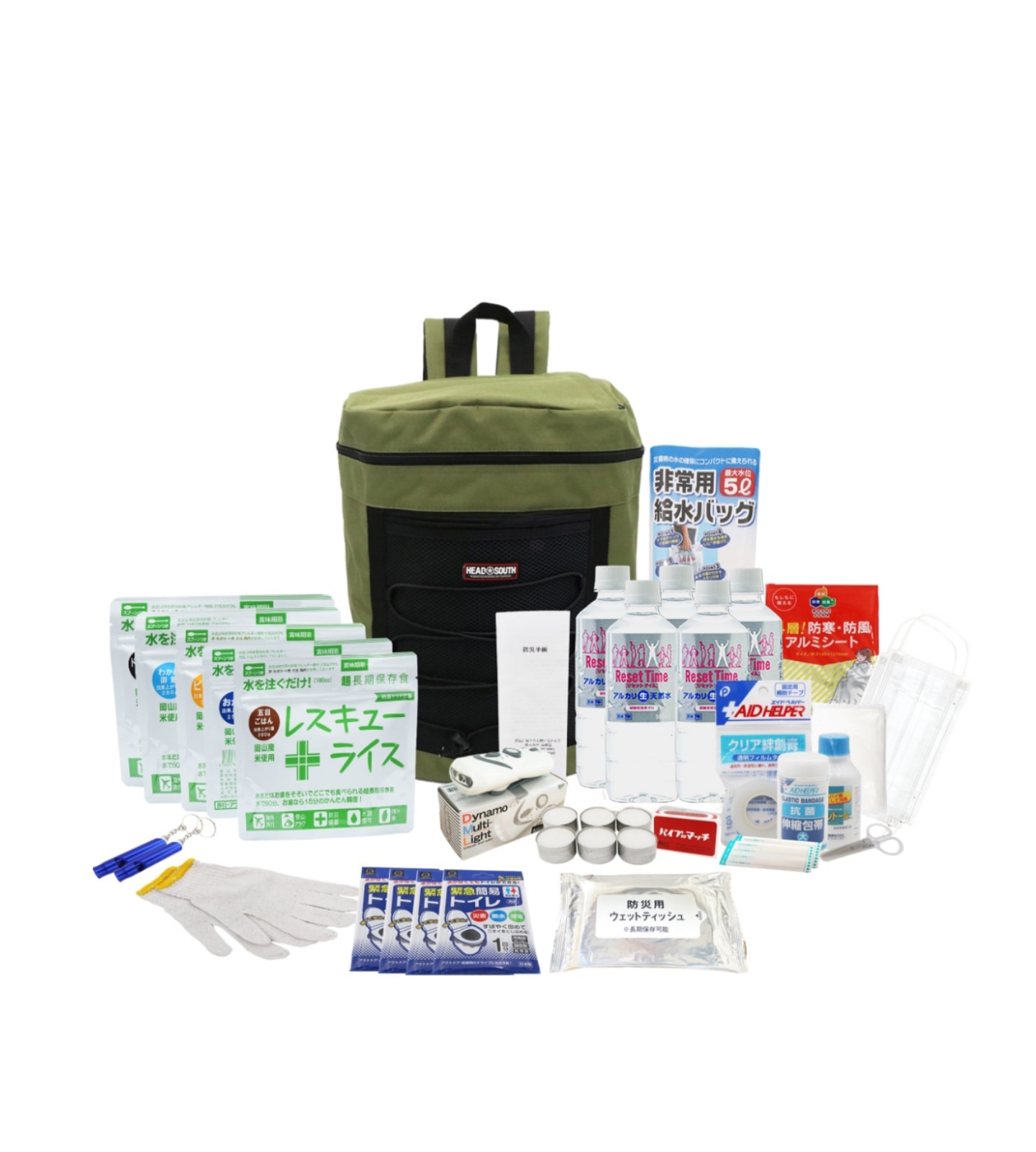 非常持ち出し用リュック(27L)×1、レスキューライス(おかゆ)×1、レスキューライス(わかめご飯)×1、レスキューライス(ドライカレー)×1、レスキューライス(ピラフ)×1、レスキューライス(五目ごはん)×1、7年保存水500ml×5、ラジオライト(スマホ充電対応)×1、軍手1双×1、アルミホイッスル×2、緊急簡易トイレ×4、レスキューシート(軽量コンパクト)×1、給水バッグ(5L)×1、カットバン×8、マスク(3層式)×2、ティッシュ×1、包帯L×1、オキシドール×1、絆創膏×1、ハサミ小×1、マッチ×1、カップろうそく×6、防災用ウェットティッシュ20P×1、防災手帳×1