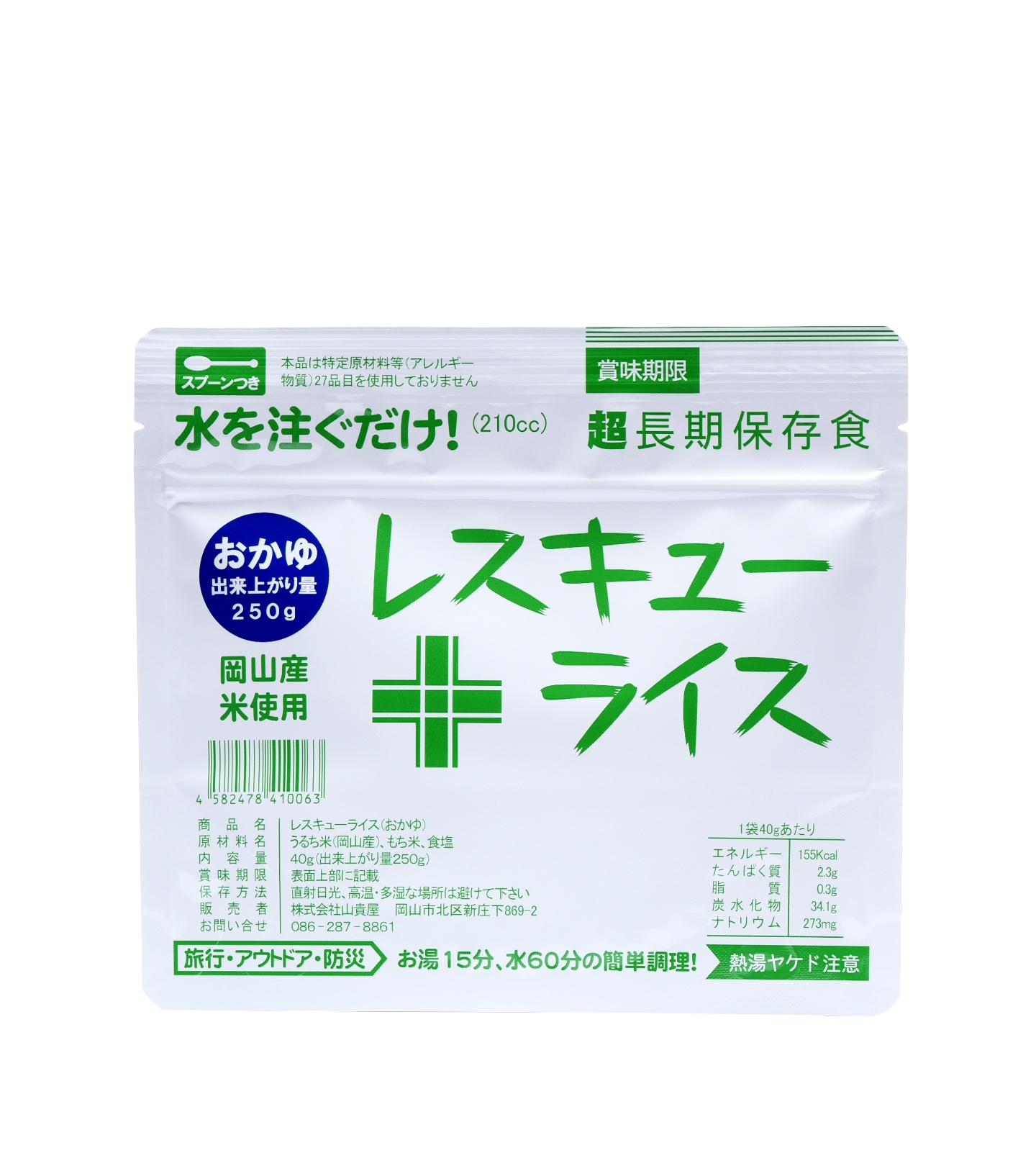 レスキューライスはオリジナル製法にて7年保存可能なアルファ米です。お湯やお水を注ぐだけで、いつでもどこでも簡単に、美味しい炊きたて風味のごはんが食べられるアルファ化米。さらにもち米入りで食感もよく、少量で効率よくエネルギー補給ができます。